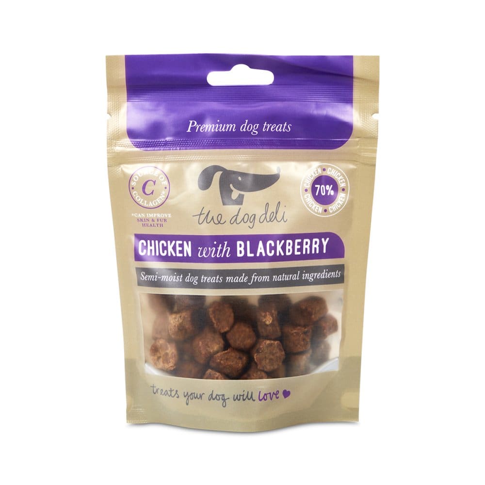 Introducing the Dog Deli Chicken with Blackberry Semi-moist dog treat nibbles, made from natural ingredients flavoured with thyme. Made in Ireland from human grade ingredients with 70% chicken content, grain free, no added salt, sugars or nasties making them a protein packed delight for your canine friend. Enriched with Collagen that can help support healthy skin and coat, promote bone development and healthy joints. Bite sized, semi moist and delicious, the perfect treat for rewarding and learning new tricks.