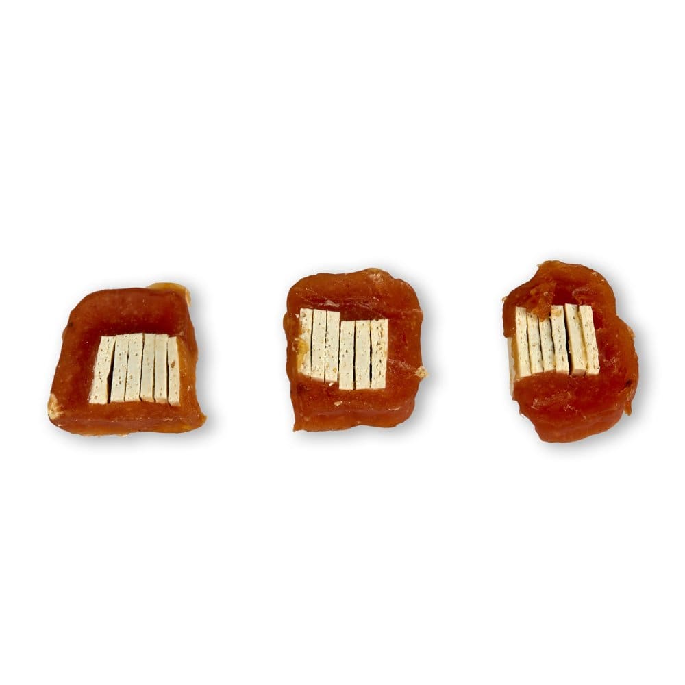 Chicken With Cod Cubes- 100g. Made with 64% Chicken and 15% Cod. No added sugars. Tasty treats your dog will love! OXY-PACK for freshness & taste Not suitable for small breed puppies under 6 months old, but suitable for large breed puppies over 4 months old. Chicken Breast: 64% Cod: 15% Vegetable Protein: 6% Wheat Flour: 4% Corn Starch: 5% Sorbitol: 2% Glycerin: 3.5% Salt: 0.4% Potassium Sorbate: 0.1%. Feed as a treat. Pets should be supervised when consuming. Choose a treat which is an appropriate size for your breed of dog. Ensure your pet has plenty of fresh water available at all times. Chews should be eaten on a non-stainable surface. Store sealed in a cool, dry place, out of direct sunlight. Reclose the bag after each use. Limit daily treats to approximately 10g for dogs under 12KG. DO NOT ALLOW PETS TO EAT THE OXY-PACK.Additional information