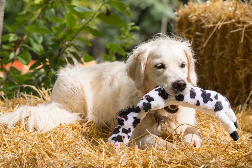 A plush and fun dog toy in the shape of a cow offering hours of play time and snuggles. Durable and with a squeak for lots of fun. Can be used as a puppy comforter. Pets should be supervised when playing with toys. This toy is strong but not indestructible and will eventually become susceptible to chew damage. Examine regularly for wear and replace if any damage could represent a health hazard.