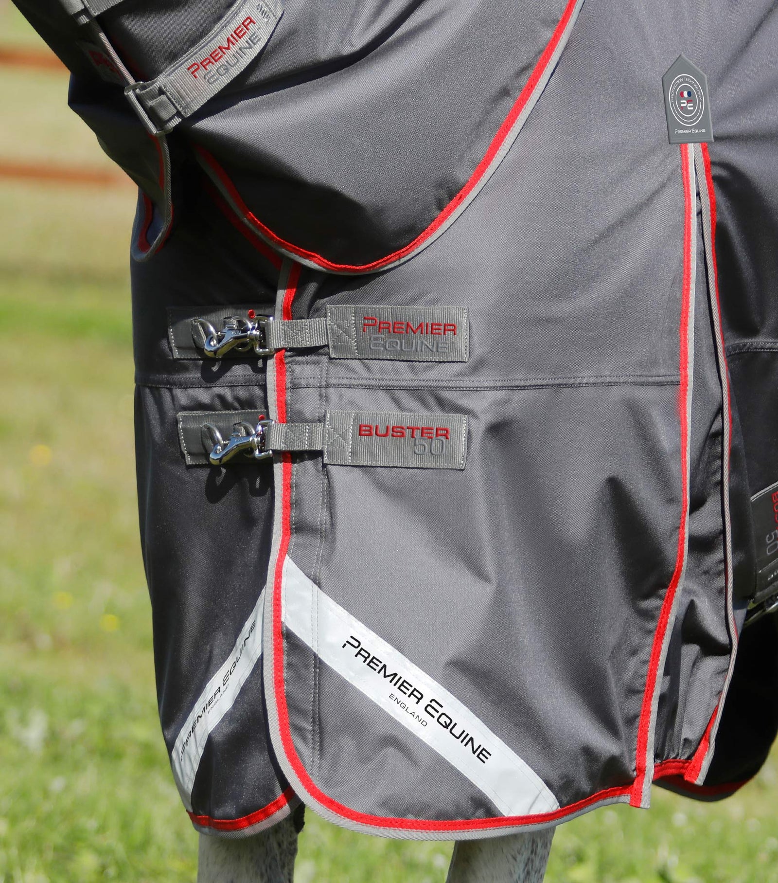 • Designed with meticulous attention to detail, the Buster 50g Turnout Rug is cut 2-4” in front of the wither allowing the neckline to fall comfortably in front of the shoulder. Evolving with time, the Buster now features an extra-high patented elasticated shoulder gusset, providing greater freedom of movement in the field. Reflective strips at the front and rear of the rug increase visibility in low-light conditions. The strategically placed chest clip closures, surcingle bars, and hardware are expertly crafted from high-quality stainless steel for long-lasting functionality.