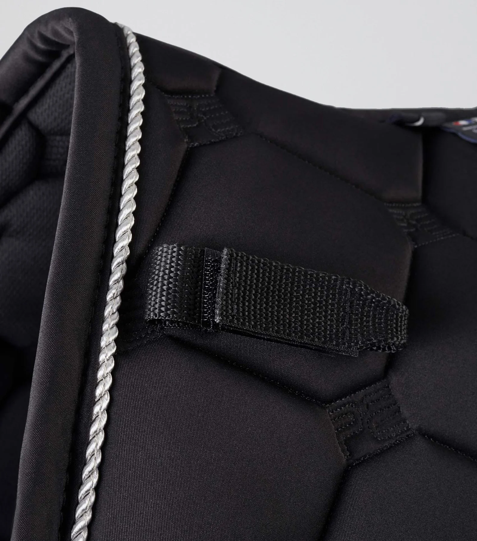 - Complete with decorative twisted ropes which accent the outer edge of the saddle square, adding a touch of embellishment. Adjustable Velcro D loop straps and Velcro girth straps allow you to secure your saddle. One of the best close contact GP / Jump squares for those who want to make a statement in the equestrian field.