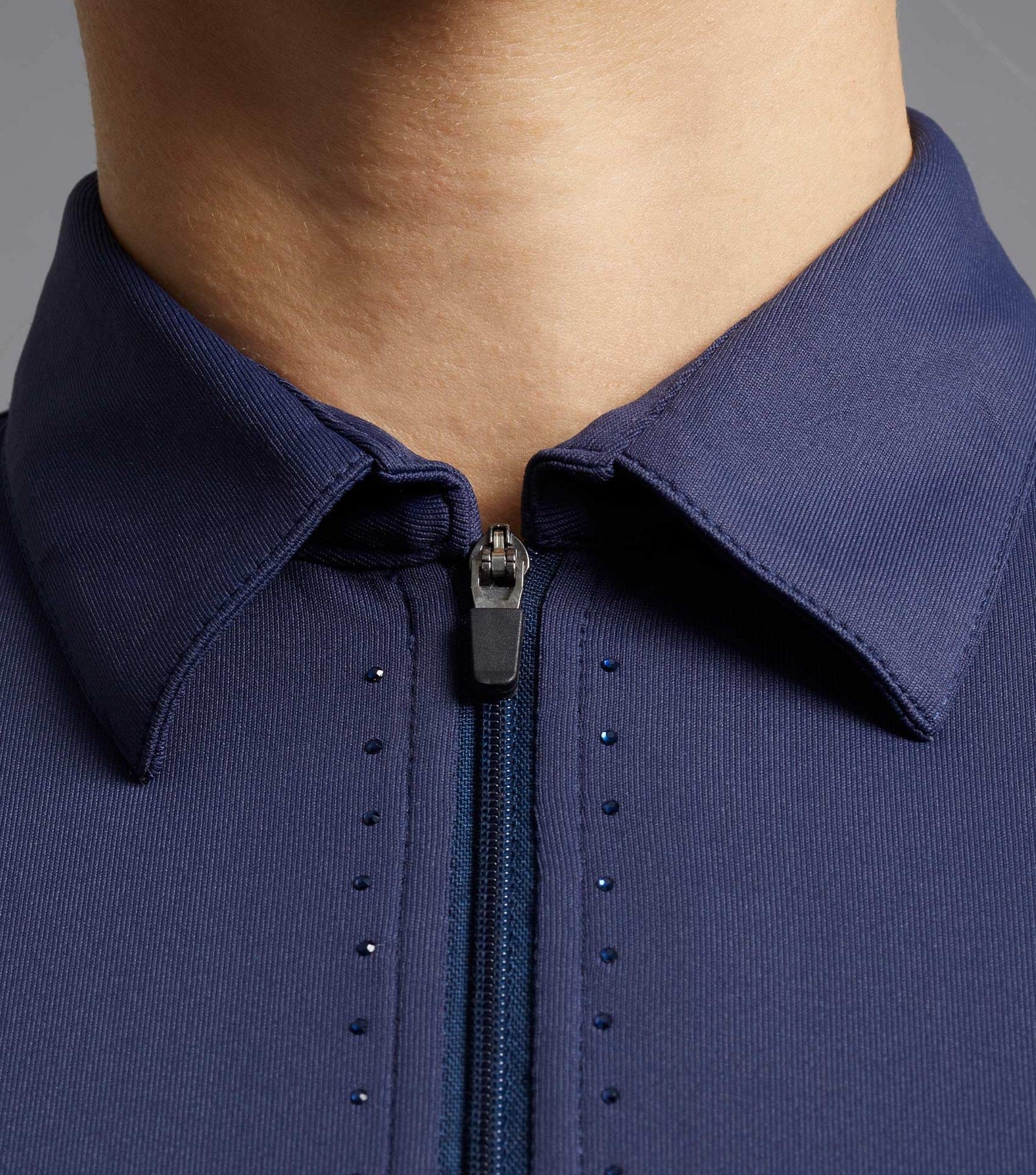 - This highly breathable short-sleeved riding top is constructed from a hybrid material, offering soft-touch comfort and moisture wicking properties. A ¹/₄ zip allows for easy closure without the need for delicate buttons. Featuring a sophisticated shirt collar and subtle tonal gemstone embellishment which surrounds the zip closure.