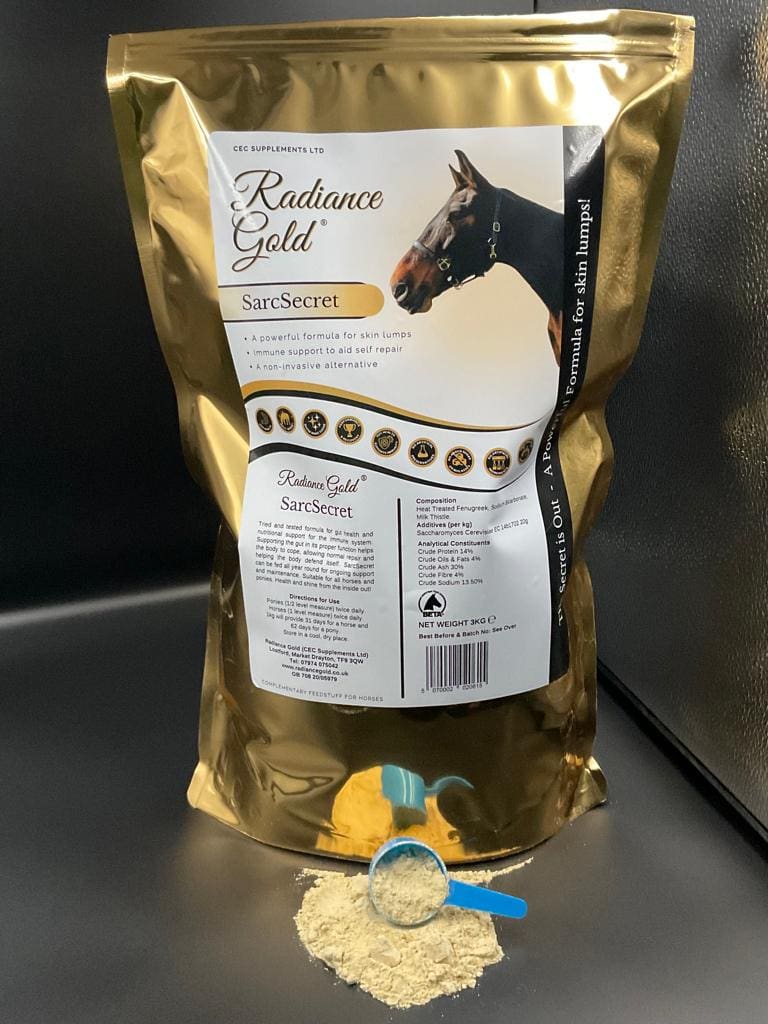 A powerful formula for skin lumps Immune support to aid self repair A non-invasive alternative SarcSecret is part of the Radiance Gold Equine range formulated by expert nutritionists using only the best ingredients. These ingredients have been shown to support a balanced gut flora, enhance digestion and useful for general well-being. No artificial preservatives, fillers or added sugar. Manufactured in a BETA NOPS audited facility. Feed hygiene establishment GB708A0003.