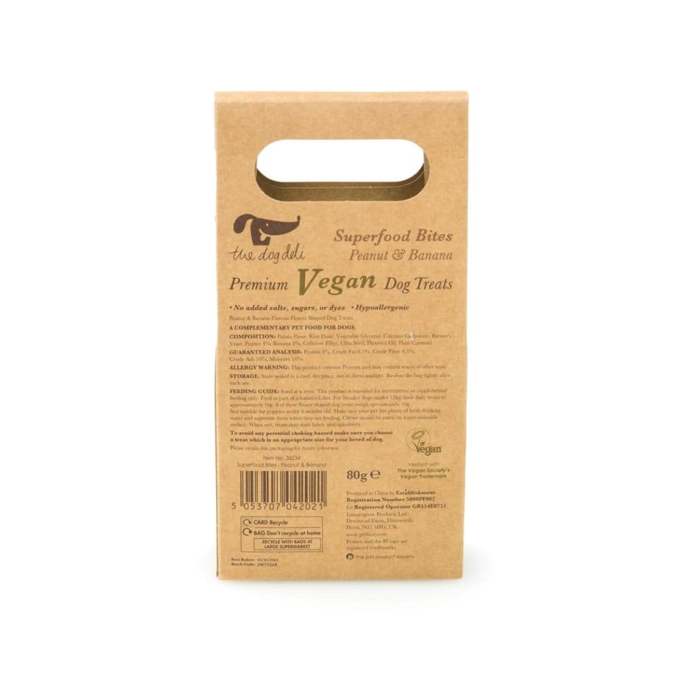 The Dog Deli Superfood Bites with Peanut and Banana from our Premium Vegan Dog Treat range are made from 100% natural wholesome ingredients. These small bite sized flower shaped treats are perfect as a training treat and when out and about. Low in fat with a flavour dogs love. Contains Brewers Yeast which is rich in antioxidants for a healthy shiny coat, Chia Seed and Flaxseed Oil that are packed with Omega-3 fatty acids known to strengthen the immune system and reduce inflammation.