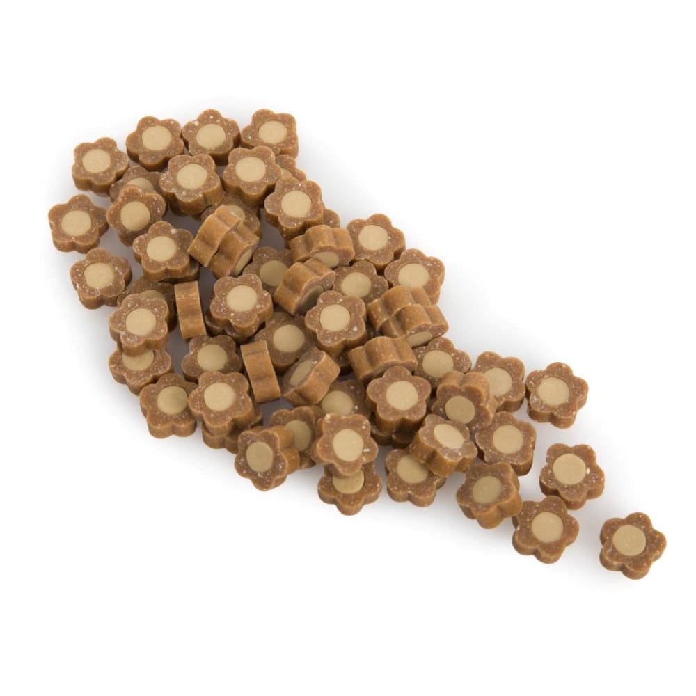 - Feed as a treat. Pets should be supervised when consuming, choose a treat which is an appropriate size for your breed of dog. Not suitable for puppies under 4 months old. Chews should be eaten on a non-stainable surface. When wet, treats may stain fabric and upholstery. This product contains Peanuts and may contain traces of other nuts. Store sealed in a cool, dry place, out of direct sunlight. Reclose the bag after each use.