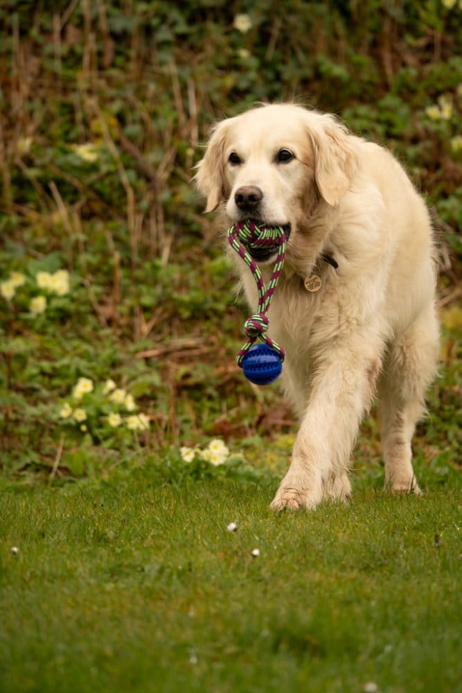 Petface Toyz Treat Ball On Rope Dog Toy is a multi-functional toy for playing and chewing. The non-toxic rubber ball has soft interlocking spikes to insert treats, kibble or treat paste providing a mental challenge that encourages problem-solving skills and prevents boredom. The rope also encourages chewing for dental care to help remove plaque and massage gums. The toy is also great for playing tug of war or a game of fetch.