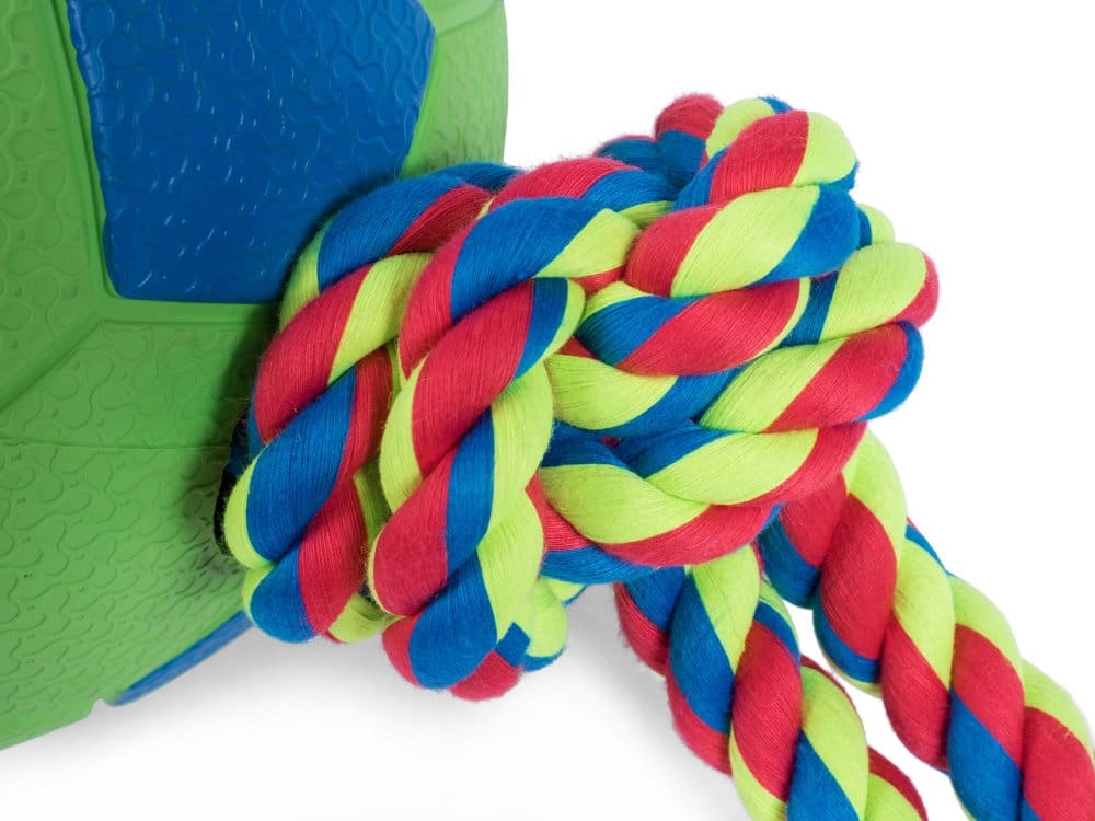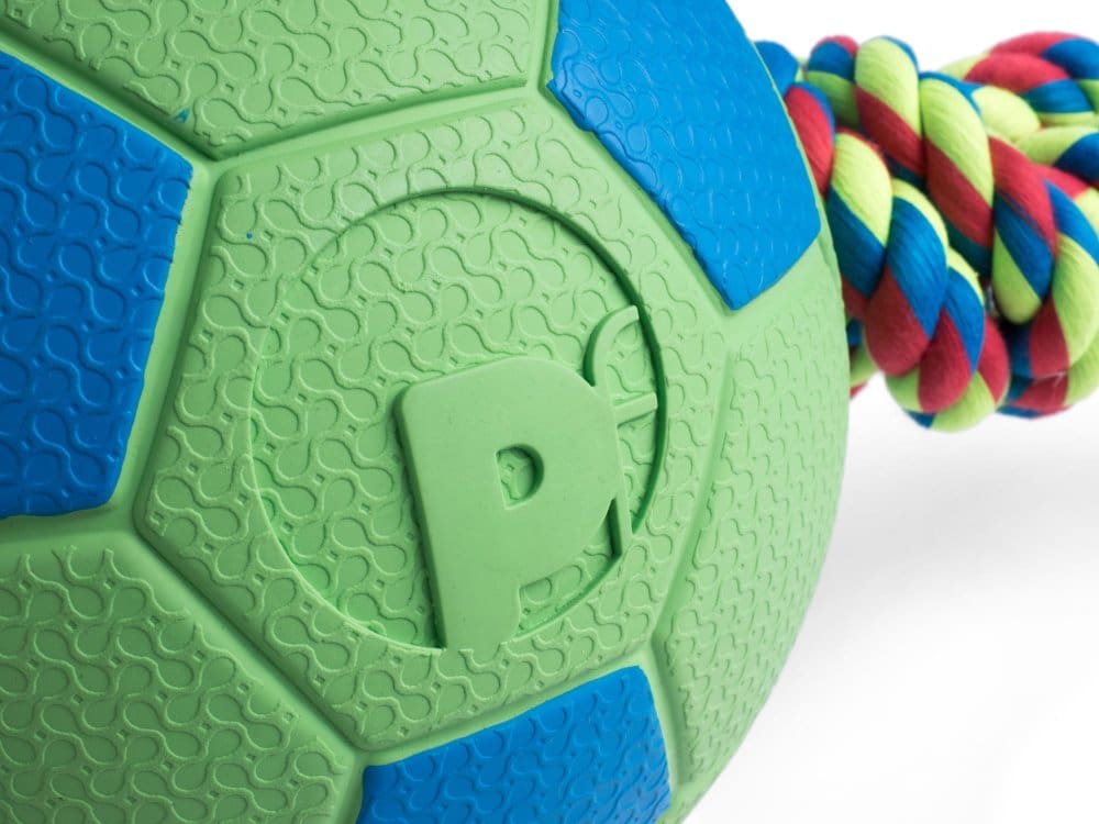 The Toyz Tug and Kick Ball by Petface is a green and blue football with multi-coloured rope. Ball is brightly coloured and durable, making them perfect for your dog to play with outdoors. Made from synthetic material and soft texture rubber. Non-Toxic so safe for your pet.